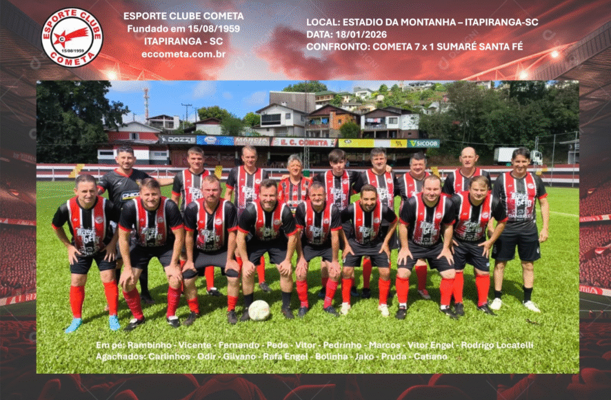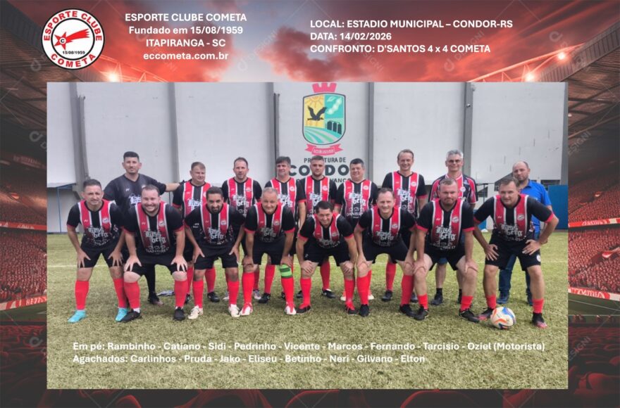 A equipe Veteranos do Cometa deslocou-se ate cidade de Condor-RS para enfrentamento com equipe local D’Santos. Enfrentamos um grande adversário e conseguimos empatar 4 x 4. O primeiro tempo foi de domínio total Cometense com placar 4 x 0. No segundo tempo cansaço tomou conta dos atletas Cometenses, e não conseguimos repetir futebol apresentado no primeiro tempo, sofrendo assim o empate.